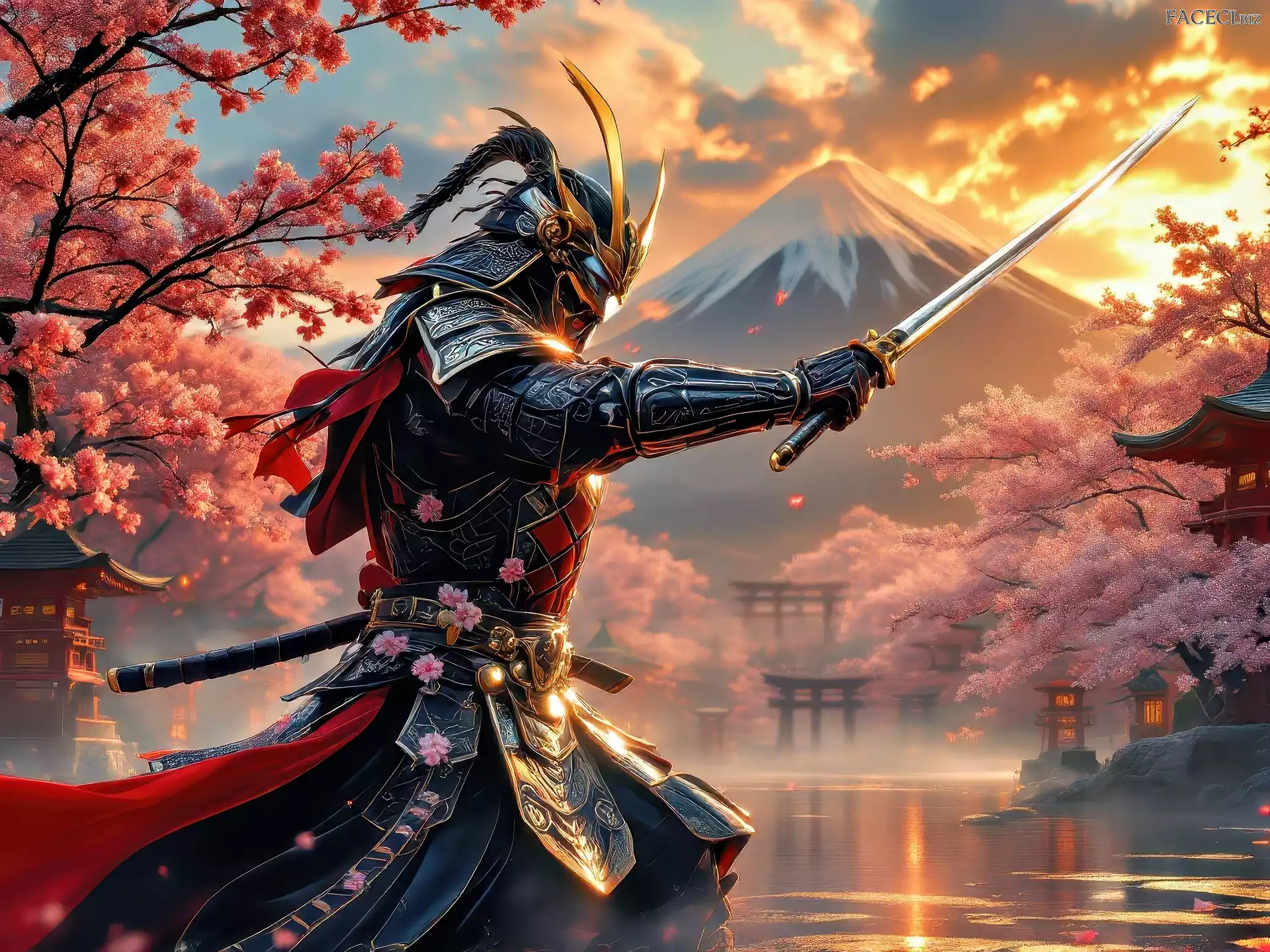 Samuraj, Wojownik, Jezioro, Grafika, Góra, Drzewa, Zbroja, Japoński, Miecz - faceci.biz